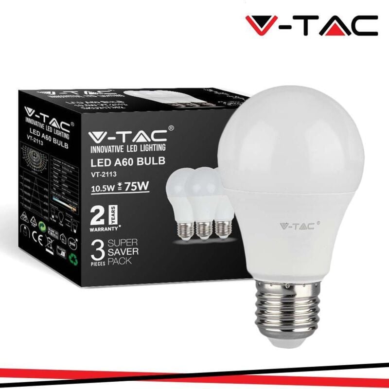 V-TAC Lampadine Lampadina LED E27 10,5W 100LM/W A60 6500K (Box 3 pezzi)