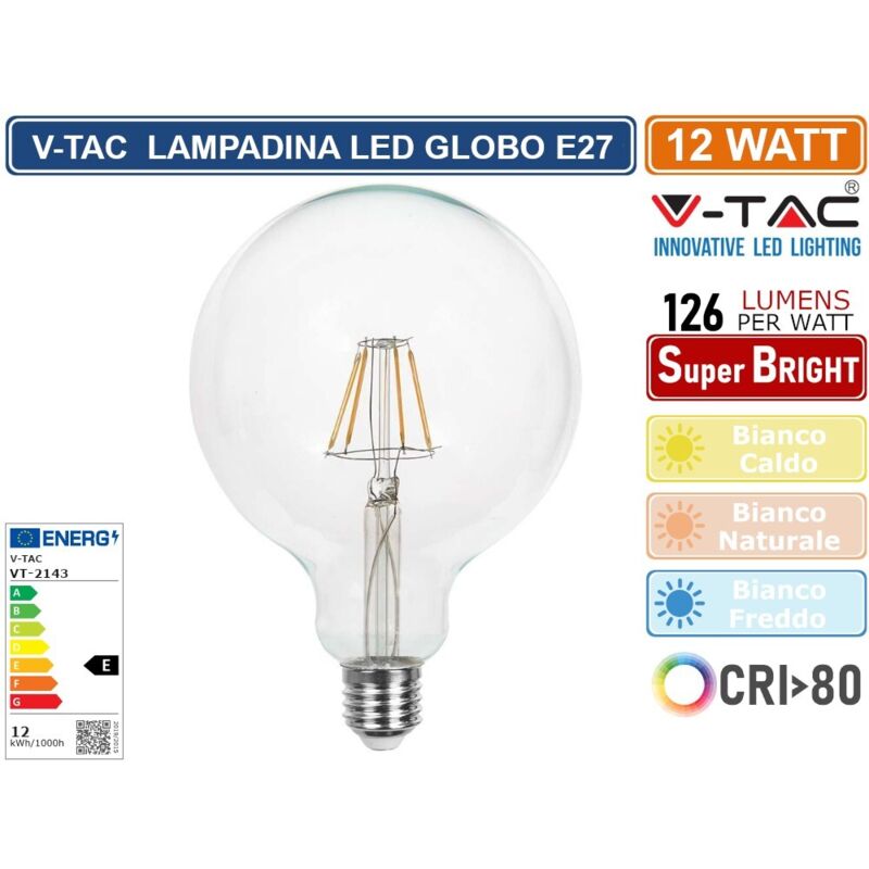 Lampadina LED E27 12W 120LM/W G125 Filamento Trasparente 6500K