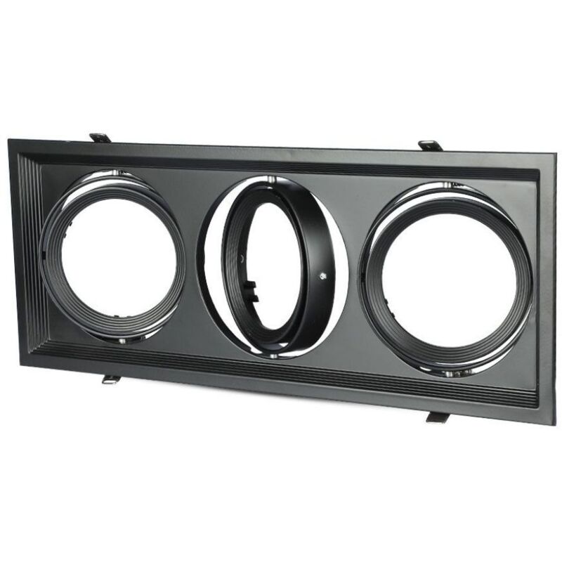 V-Tac VT-7223 Supporto orientabile quadrato da incasso per 3 lampadine AR111. Realizzato in metallo colore Nero . Portafaretto adatto ad essere inserito in controsoffitti in cartongesso, legno, mensole ecc. Questo porta faretto è dotato inoltre di 3 anelli orientabili che consente di modificare l'inclinazione dei faretti fino a 90° su 2 assi. Compatibile con tutti i tipi di lampade AR111. Dimensioni: 490 x 186 mm. Dimensioni foro incasso: 465 x 165 mm.