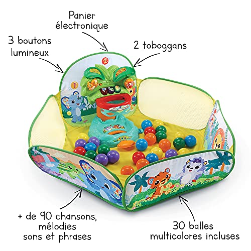 Interattivo: il cestino è interattivo, riconosce quando Baby segna punti e conta le palle/3 pulsanti luminosi per imparare numeri, colori e animali/2 rampe per vedere degringolare le palle/bambino espelle le palle premendo il pulsante centrale