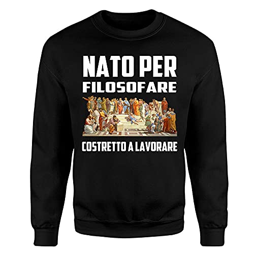 Questa felpa divertente girocollo da uomo è perfetta come regalo per gli amanti della filosofia, se anche tu la ami o se vuoi regalare qualcosa di particolare non puoi rinunciare a questa felpa con la scritta "Nato per filosofare, costretto a lavorare". Questa felpa Unisex è una perfetta idea regalo originale.