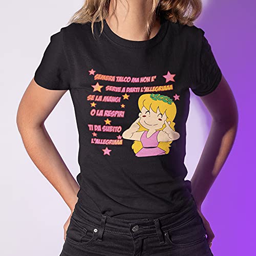 Questa fantastica e divertente maglia cartoni animati pollon da donna con su scritto "Sembrava talco ma non è serve a darti l'allegria se la mangi o la respiri ti da subito l'allegria" è fatta apposta per tutte le amanti della maglietta pollon donna, maglietta donna cartoni animati anni 80 e fan del famoso pollon dvd. Se anche tu hai guardato questo cartone animato questa tshirt cartoni animati è perfetta. Perfetta per ogni circostanza e come idea regalo t shirt donna divertenti cartoni