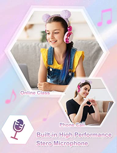 VuyKoo Cuffie Bluetooth per bambini con microfono, Cuffie Wireless limitatore 85dB, Cuffie On-Ear pieghevoli per Smartphone/scuola/scrivania/PC/Kindle, Regalo di Natale/Compleanno per bambini (Rosa)