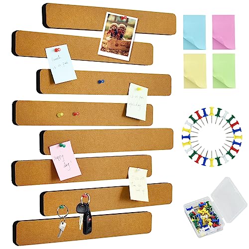 Vuzvuv 8 strisce di legno marrone in sughero con 50 puntine e foglietti adesivi, autoadesive, nessun danno per parete, bacheca in feltro per incollare appunti, foto, programmi, uffici casa