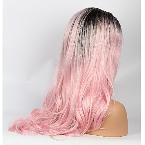 VvBing Long Pink Wig Lace Front Synthetic 2 Tones Ombre Black Hair Roots to Pastel Pink Wig Glueless Wave Hair Heat Resistant Fibers Middle Parting For Party 24inch