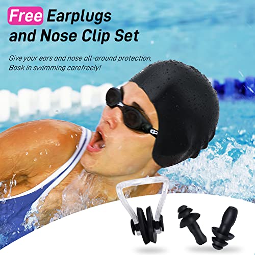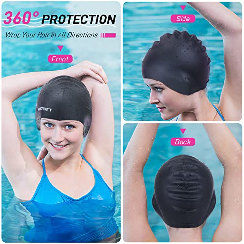 Vzzeport Cappello da Nuoto in Silicone, Cuffia da Nuoto con Stringinaso e Tappi per Orecchie, Cappello Unisex da Nuoto per Piscina, Protezione di Nuotata, Cuffia Piscina Uomo Donna, Taglia L, Nero