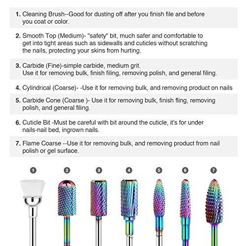 Wadeo Set di punte per fresa per unghie, 7 pezzi, in carburo di tungsteno, 3/32”, per manicure, pedicure, fresa elettrica, per nail art, lucidatura per unghie (arcobaleno)