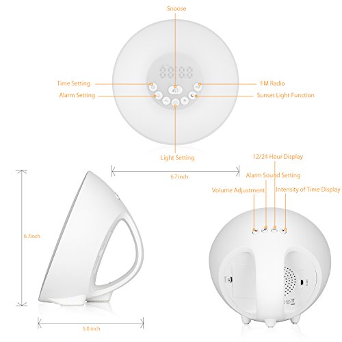 Sunrise / Sunset Simulation - La modalità Sunrise consente a questa luce di svegliarsi gradualmente la luminosità dell'1% al 100% in 30 minuti prima del tempo dell'allarme e delicatamente la sveglia con i suoni naturali. La modalità Sunset diminuisce gradualmente la luminosità mentre si addormenta di notte.