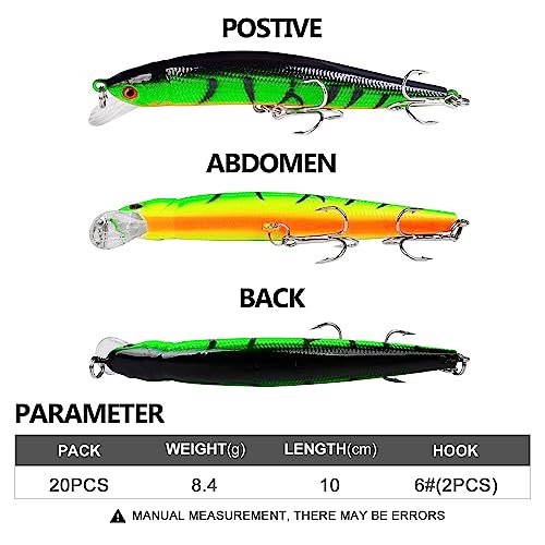 【Esche di rapporto qualità-prezzo】Questo set di esche artificiali Wobbler ha 20 pezzi di esche, imitano principalmente piccoli pesci che si vedono in natura, come ad esempio: i movimenti di piccoli pesci che galleggiano sull'acqua, toccano l'acqua con la testa verso l'alto o raggiungono il terreno dopo il cibo e altre diverse azioni. Il pescatore può mostrare l'azione di oscillazione a sinistra e a destra attraverso queste esche e catturare i pesci sull'amo.