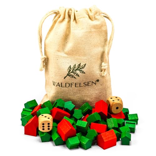 Waldfelsen Personaggi da gioco originali in legno, 32 case verdi e 12 grandi hotel rossi con sacchetto di stoffa, personaggi classici, materiale da gioco