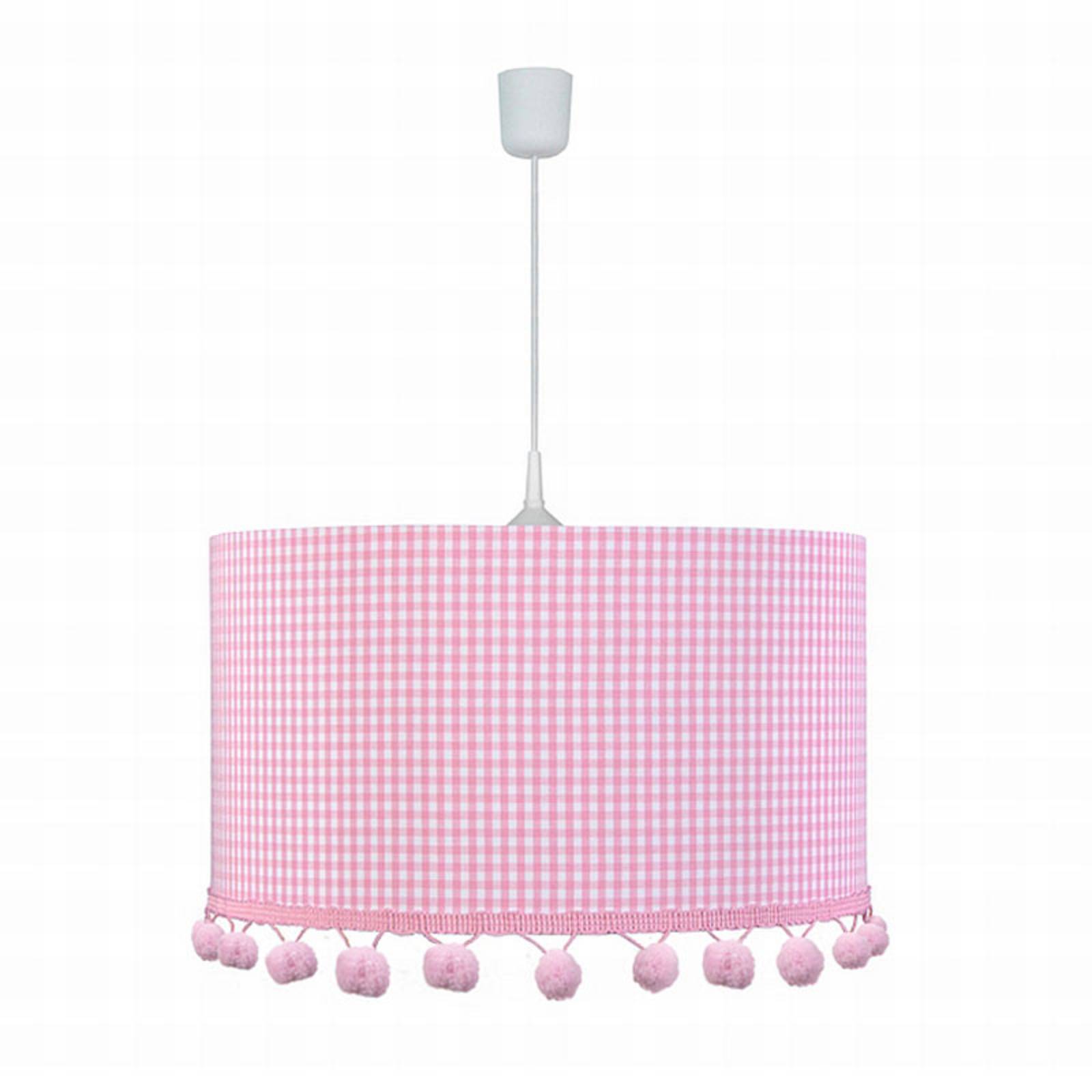 Graziosa lampada a sospensione in tessuto Vichy con pompon decorativi Il paralume arrotolato a mano della lampada a sospensione per camera dei bambini Vichy è realizzato in cotone con un bellissimo motivo a quadri in rosato e bianco. Sul bordo inferiore è decorato con piccoli pompon, che pendono su corde. La lampada a sospensione Vichy è un prodotto di qualità, che è stato fabbricato completamente in Germania con materiali privi di sostanze inquinanti. Il produttore attribuisce grande importanza all'assoluta innocuità di tutti i materiali utilizzati. Per la produzione di lampade da camera per bambini di prima classe vengono quindi utilizzate solo materie plastiche prive di cadmio e colori privi di sostanze inquinanti, oltre al legno.