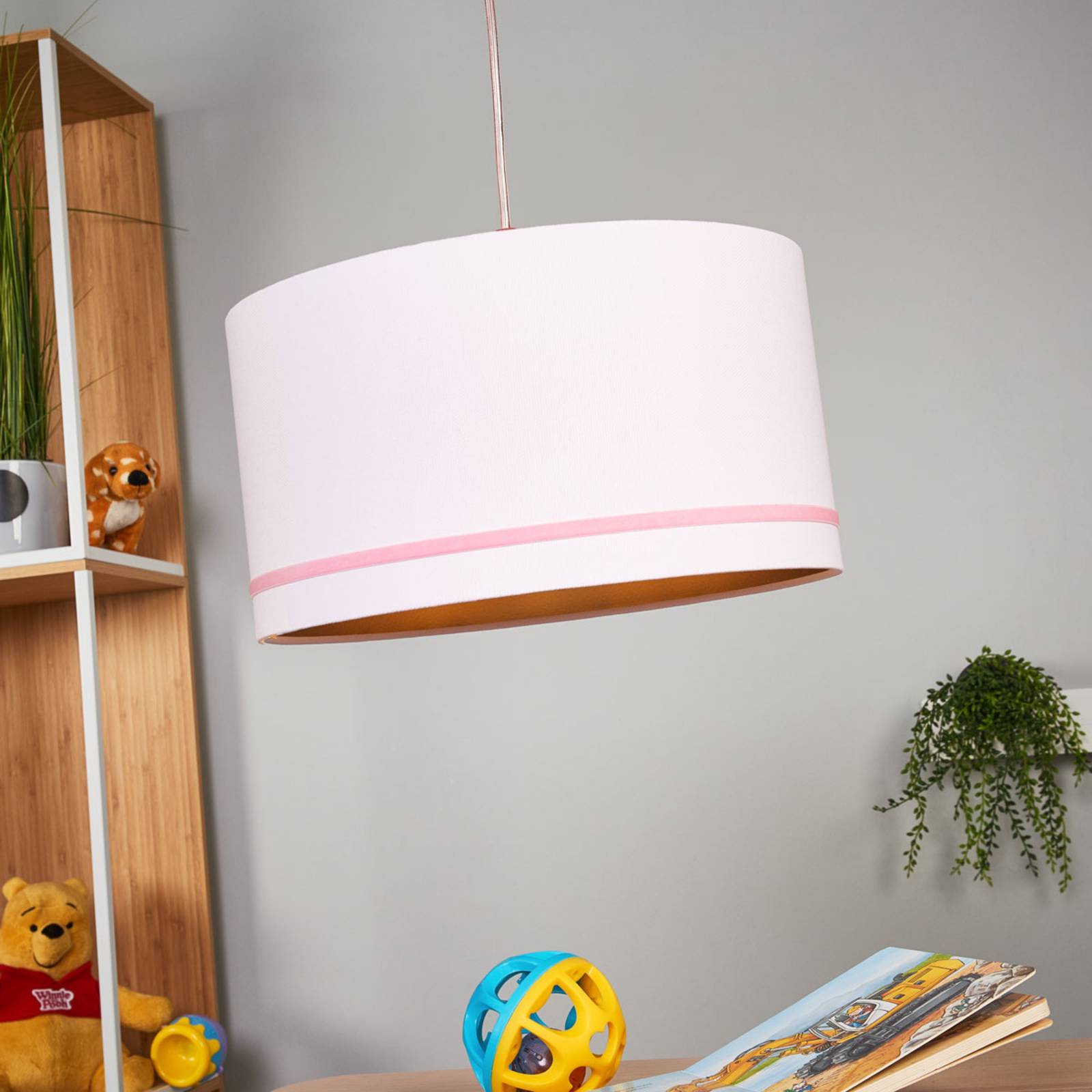 Apparecchio a sospensione Estria con esclusiva paralume placcato oro in un delicato design a strisce Grazie ai suoi colori tenui e al suo design delicato, l'apparecchio a sospensione Estria è perfetto per la stanza di un bambino o anche per la stanza di un adolescente. La tonalità cilindrica di forma classica è in cotone, con l'interno laminato in oro. Ciò garantisce una luce particolarmente brillante, che viene riflessa dalle pareti interne dell'ombra. Lo stretto nastro di velluto rosa sul bordo inferiore arrotonda abilmente l'aspetto elegante della lampada a sospensione. Le lampade da camera per bambini di questo produttore sono prodotte in Germania. Vengono utilizzati solo materiali selezionati, privi di sostanze tossiche e innocui per le camere dei bambini. L'accurata lavorazione e i materiali di alta qualità garantiscono un prodotto che vi piacerà a lungo.