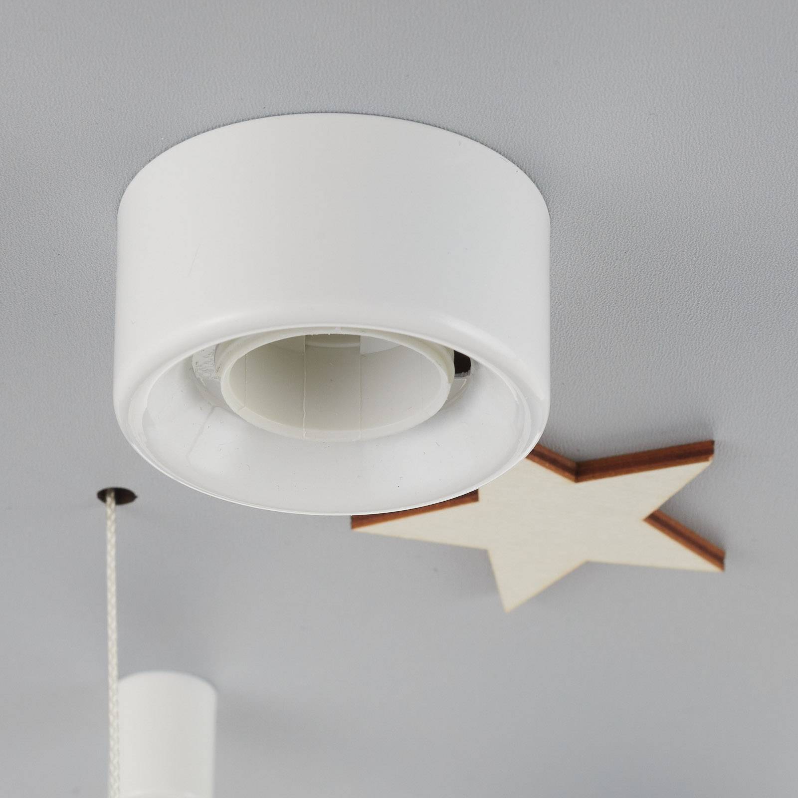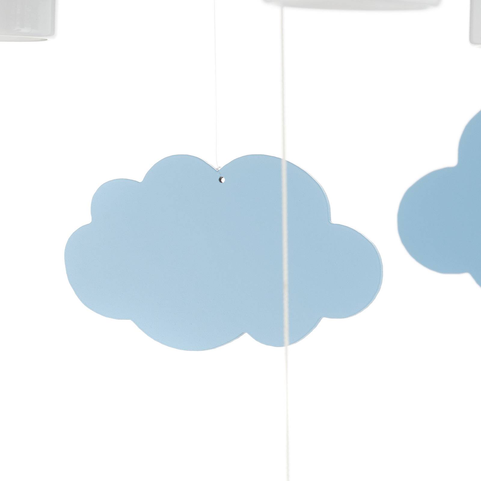 Fantastica plafoniera Cloud per la camera dei bambini con arredamento pensile La lampada da soffitto a cinque fiamme Wolke è, come suggerisce il nome, prodotta a forma di grande nuvola. È realizzato in legno di alta qualità e viene mantenuto in grigio neutro. Sulla nuvola stessa ci sono piccole stelle e come decorazione appesa, oltre alle nuvole blu. Oltre alle cinque sorgenti luminose principali, che qui non sono incluse, dieci luci snooze a LED commutabili decorano la lampada. Questi vengono attivati dall'interruttore a tirare con stella al centro. Questi forniscono la luce ideale per addormentarsi dolcemente, soprattutto la sera.
