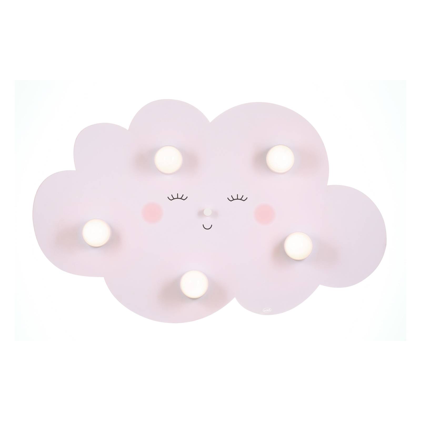 Lampada da soffitto faccia nuvola in rosa, cinque fiamme A forma di nuvola, la lampada da soffitto cloud face è stata realizzata in legno in Germania e dipinta di rosa. La plafoniera era decorata solo con un motivo di un volto con occhi chiusi, bocca, naso e guance rosse. La faccia è incorniciata dalle cinque prese, che sono fatte di ferro polverizzato e in cui si possono inserire lampadine con base E14 fino a 40 W. Per rendere il look perfetto, si consiglia di utilizzare lampade a goccia con finitura bianca opaca.