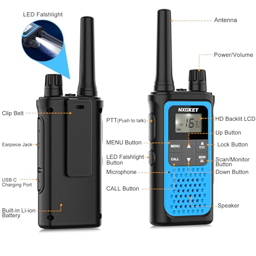 【SUONO CRISTALLINO E SUPPORTA QUALSIASI STESSO CANALE RADIO】con una potenza di trasmissione più elevata, altoparlanti più grandi aggiornati, tecnologia di squelch automatico e impostazione della sensibilità che consente di ascoltare un suono chiaro senza distorsioni o rumori in ogni occasione. NXGKET walkie-talkie professionali ha 16 canali e 121 codici di eliminazione delle interferenze, puoi comunicare con altri walkie talkie indipendentemente dalla marca proteggendo la tua conversazione.