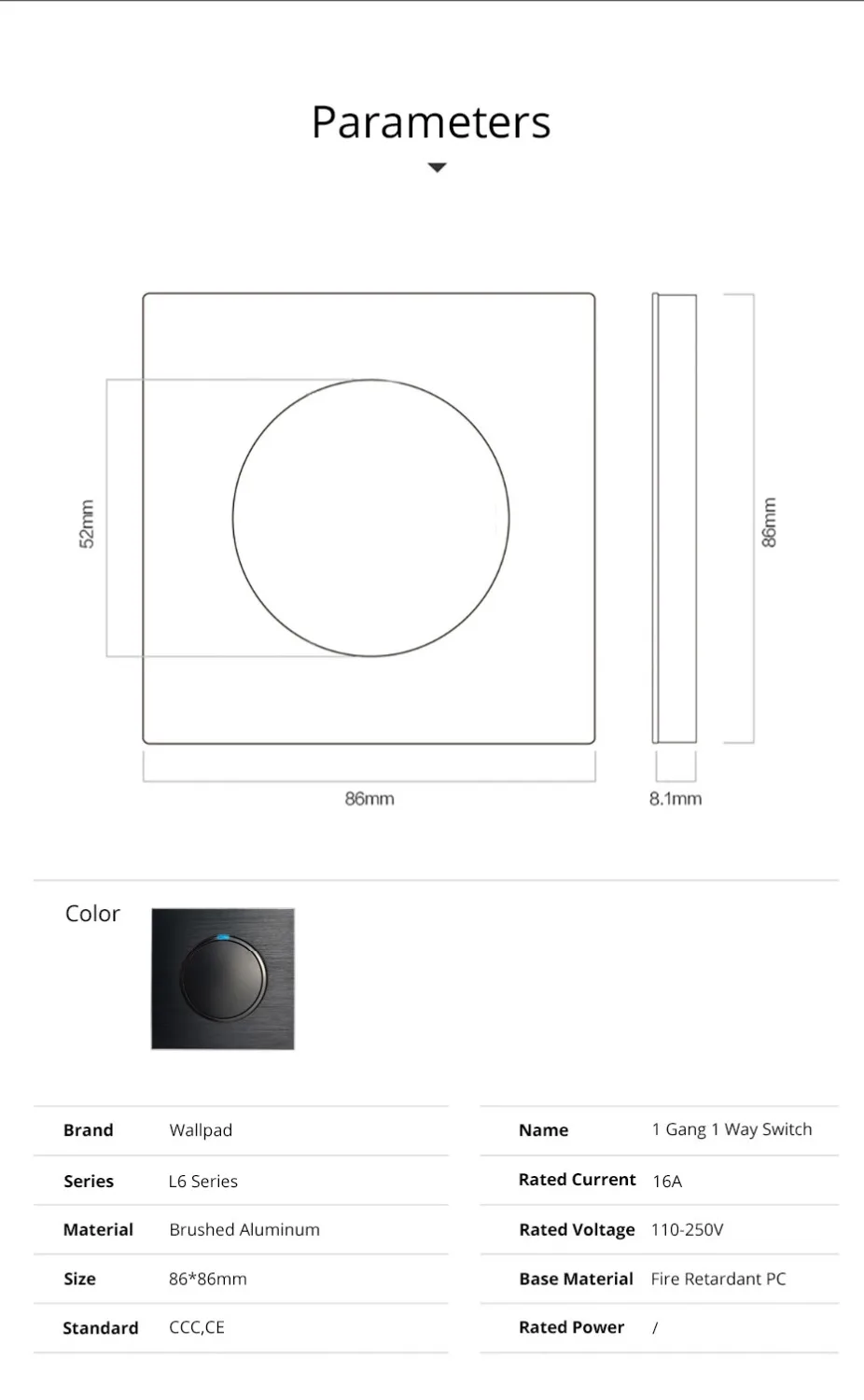 Wallpad L6 Black Metal 1 Gang 1 Way Wall Light Switch Aluminum Plate Random Click Push Return Button With Blue LED Indicator
