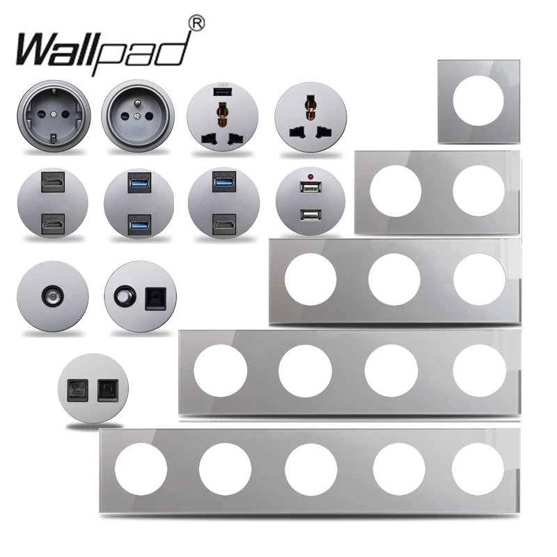 Wallpad L6 Grey Cristal Glass EU French Power Wall Socket USB Charger Data CAT6 HDMI TV Universal Outlet Modules Combination