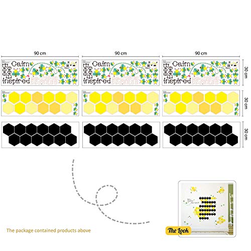 Questa lavagna a nido d'ape con motivo esagonale è disponibile in 9 fogli di adesivi 30x90 cm, con 36 lavagne esagonali, 36 esagoni gialli e 84 api