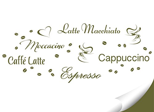 Wandora, G006, adesivi da parete per cucina con scritte: “Latte Macchiato”, “Moccacino”, “Cappuccino”, “Espresso” “caffè Latte” e con chicchi di caffè, verde oliva, Kreativset