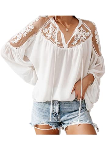 WangsCanis Blusa Donna Casual Elegante Camicetta Larga in Chiffon con Pizzo Ricamato di Fiori Scollo a V Maniche Lunghe a Sbuffo (Bianco, M