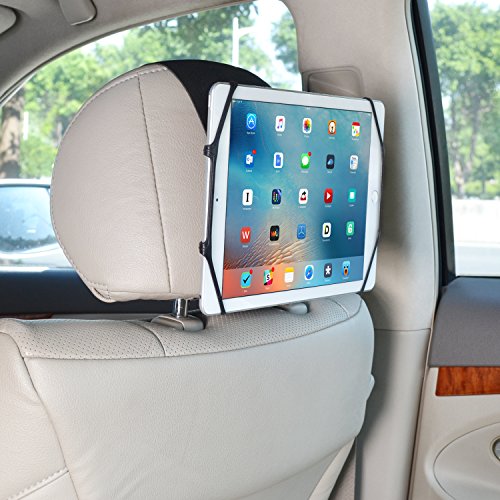Supporto universale per auto - funziona con tablet da 7 a 10,5 pollici e con telefoni da 4,5 a 6 pollici. Il pacchetto include una cinghia per il poggiatesta, una retina di ritenzione per telefono/tablet in silicone, un adattatore angolare rimovibile.