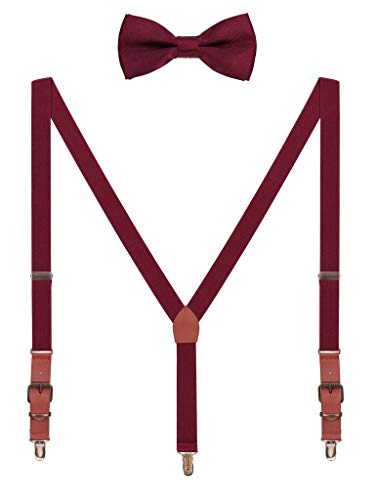 WANYING Classico Bretelle e Papillon Set per Uomo Donna, Bretelle 3 Clip Antiruggine Pelle PU Forma Y Larghezza 2,5cm Elastiche Regolabili per Statura 140-190cm - Rosso Bordeaux
