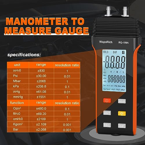 WapoRich Manometro Differenziale,Gas Pressure Tester Differenziale HVAC Air Pressure Meter,Misuratore di pressione dell'aria professionale a due porte RQ-189A