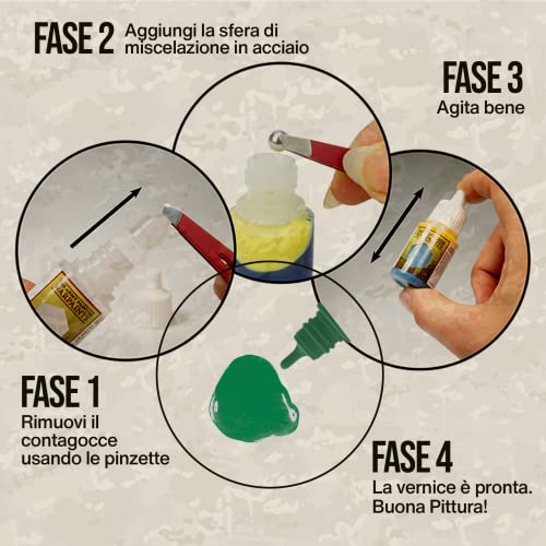 Cosa c'è dentro? 18 colori di vernice, 2 pennelli, 2 bottiglie vuote per la miscelazione, 20 palline di miscelazione