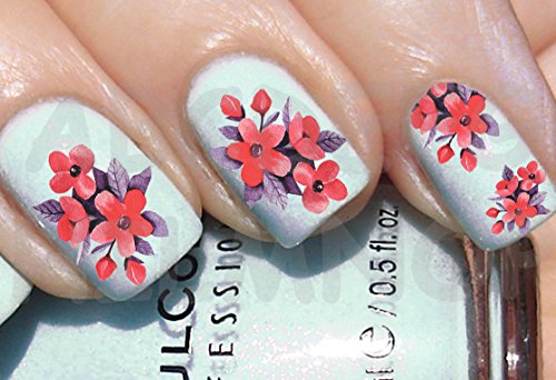 AWS set Water decals Fiore Rosso fiori Stile acquerello foglia viola unghie nail art Adesivi stickers transfer decorazione flowers red purple leaves