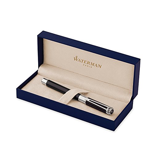 Waterman Perspective Penna Roller, Punta Media con Cartuccia di Inchiostro Nero, Nero Lucido con Finiture Cromate, Confezione Regalo