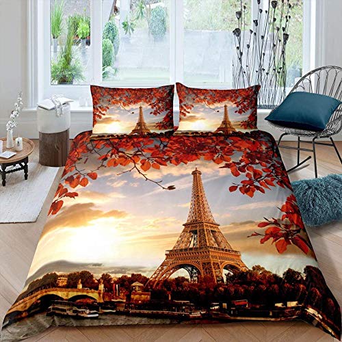 Watpasper Set Copripiumino Matrimoniale 3 Pezzi 3D in Microfibra Foglie di Rosso del Paesaggio di Tramonto di Tema della Torre Eiffel di Parigi Singolo (135 X 200 Cm) Stampa Digitale, Copripiumino Se