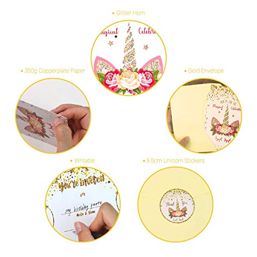WAVEJOE Unicorn Invitation 24 Pack Cards Glitter Face, 24 Envelopes Double Sided, 24 Unicorn Round Stickers