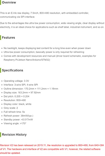 Note:Version 2 please use corresponding demo code in wiki.This is an E-Ink raw display, 7.5inch, 800×480 resolution, with embedded controller, communicating via SPI interface.Due to the advantages like ultra low power consumption, wide viewing angle, clear display without electricity, it is an ideal choice for applications such as shelf label, industrial instrument, and so on.