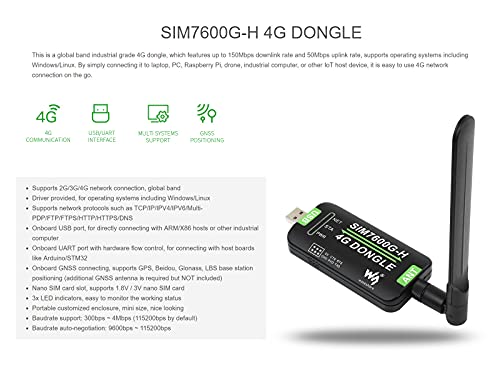 Waveshare SIM7600G-H 4G DONGLE, with Antenna, Compatible with Windows/Linux