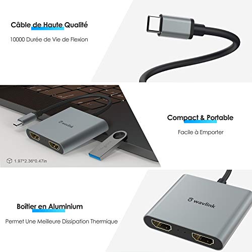 WAVLINK Adattatore USB-C a doppio HDMI 4k MST, portatile hub USB C HDMI, convertitore da tipo C a HDMI 4K, per Macbook Pro, Macbook Air, iPad Pro e Plus, compatibile con Windows, Mac OS, Linux