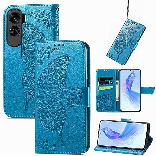 WBWONE Leather Folio Cover per Honor 90 Lite, Goffratura a Farfalla Custodia in Pelle PU Magnetica Libro Flip Portafoglio Case con [Funzione Stand]. Blu