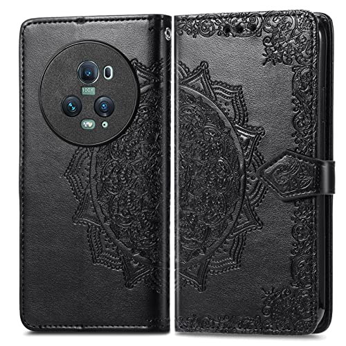 WBWONE Leather Folio Cover per Huawei Honor Magic5 Pro (Magic 5 Pro), Goffratura a Mandala Custodia in Pelle PU Magnetica Libro Flip Portafoglio Case con [Funzione Stand]. Nero