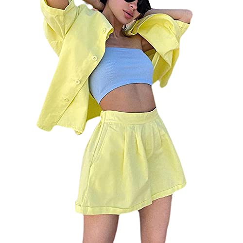 Wdehow Completi Donna 2 Pezzi Set Cotone Lino Casual Tuta Manica Lunga Camicia abbottonata e Pantaloncini a Vita Alta Set di Pantaloni Set da Salotto per Le Vacanze estive (Yellow, Large)