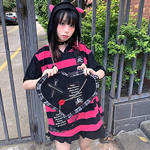 Wdhybwcx T Shirt Summer Goth Striped Graphic Grunge Punk Black Devil Ears Hoodie Women Gothic Alt Clothes-Rose Red And Black,M