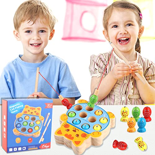 WDJLNZB Gioco di Pesca in Legno per Bambini, Giochi Montessori Giochi Bambini Giochi di Pesca Magnetico per Bambini in Legno, con 2 Canne e 10 Pesci, Regali per Bambini di 3 4 5 Anni (Gattini)