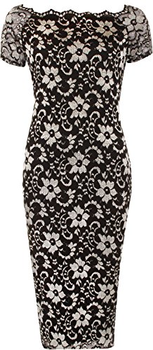 WearAll Nuovo Donna Forte Floreale di Pizzo Foderato Smerlo Collo Manica Corta, da Donna Vestito Attillato 14-28 - Argento, 14