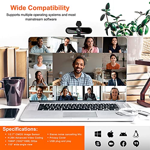 Webcam per PC con Microfono 1080P Web Cam Fisso USB 2.0 Full HD Telecamera Streaming Plug and Play con Clip Regolabile,Copertura Privacy,Grandangolo a 110 Gradi per Videochiamate,Studi,Conferenze
