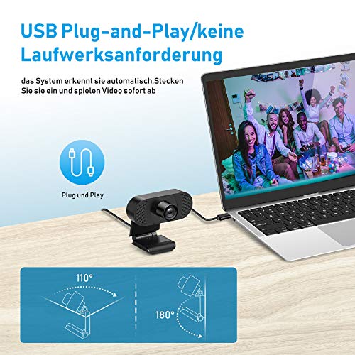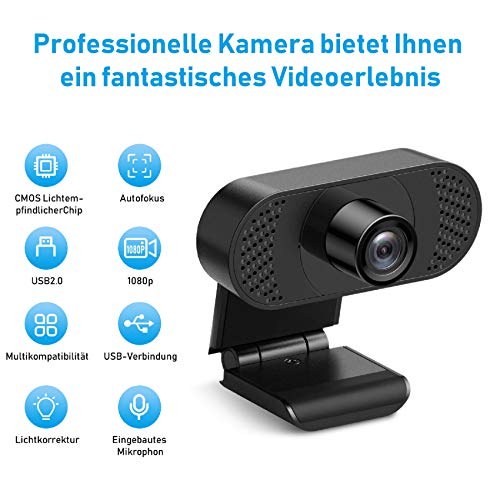 Webcam con microfono, Ehome Webcam 1080P per laptop, desktop, USB 2.0 Plug & Play, Webcam pc,Correzione automatica della luce per streaming live videochiamate, lezioni online, conferenza, gioco