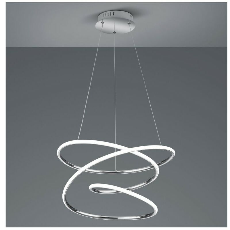 Il lampadario a sospensione BOLOGNA di Trio Lighting presenta uno struttura in metallo cromato con diffusore circolare, ondulato su se stesso, come a voler formare un vortice di luce. Cavetti regolabili in lunghezza che permettono di impostare l'altezza del diffusore in base le proprie esigenze. Sorgente luminosa a LED integrato da 36 watt, ottima resa luminosa 5100 lumen, temperatura colore 4000k (effetto bianco neutro). Grazie alla funzione dimmer è possibile regolare l'intensità luminosa a diversi livelli, grazie al normale interruttore della luce. Questa lampada non è compatibile con dimmer esterno, la sua luce può variare solo tramite dimmer integrato. Una sospensione dal design ultramoderno e accattivante, linee circolari e sinuose, un vortice luminoso che illumina e arreda con stile ed eleganza la vostra casa moderna. Ideale per illuminare in maniera diffusa il tavolo della vostra cucina moderna o ancora la console del vostro soggiorno living, loft, open space o salotto. A