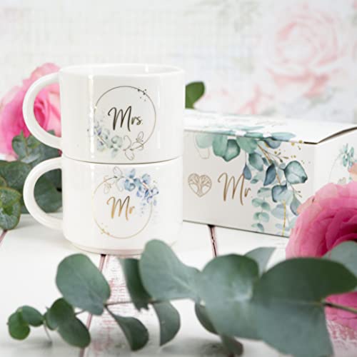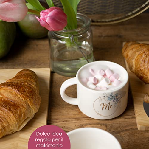 IL SET INCLUDE: set di 2 tazze WeddingTree per sposi, motivo Mr e Mrs, caratteristiche: 9 cm A, 9 cm Ø, 300 g, capacità 410 ml ciascuna