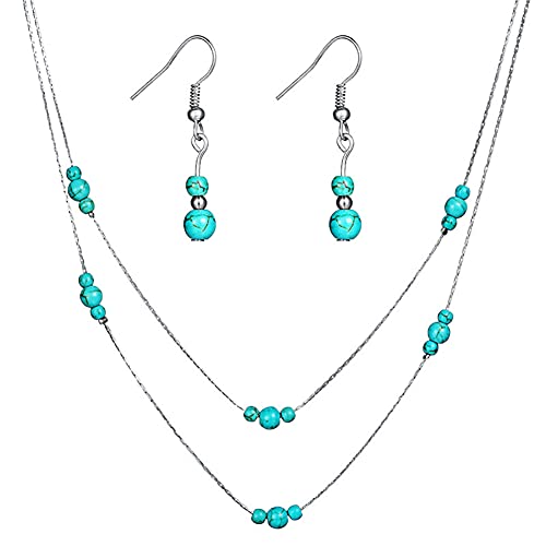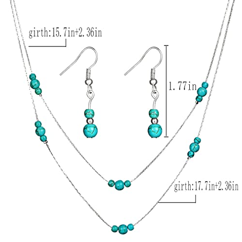 Wedity Doppio Strato Turchese Collana Orecchino Set Retro Rotondo Turchese Ciondolo Fatti A Mano Girocollo Collane Gioielli Regolabili per Donne e Ragazze (Argento)