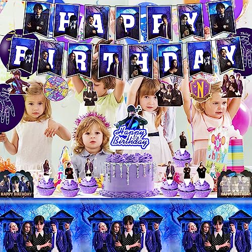 【Decorazione di compleanno Wednesday】 Riceverai 1 striscione "Happy Birthday", 1 tovaglia, 1 decorazione per torta grande, 12 topper per cupcake, 6 decorazioni a spirale da appendere, 18 palloncini in lattice, 12 biglietti di invito.