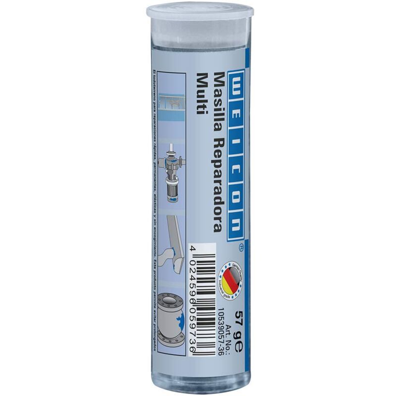 WEICON Repair Stick Multi Applicazione: WEICON Repair Stick è adatto per l'adesione permanente e resistente all'usura e alla riparazione di crepe, fori, punti difettosi, perdite e perdite su quasi tutte le superfici, come metallo, legno, pietra, vetro, plastica, GRP e molti altri materiali. Grazie alla sua applicazione universale, WEICON Repair Stick Multi è adatto per una vasta gamma di applicazioni industriali, nonché per applicazioni artigianali e fai da te. Proprietà: la resina epossidica pastosa (riempita di minerali) ha una resistenza alla temperatura da -50°C a +120°C (corta. Fino a +150 °C) e una temperatura di lavorazione da +10 °C a +40 °C. La temperatura di asciugatura varia da +6°C a +40°C con una durata di 4 minuti (a 25 g. di quantità di preparazione e + 20 °C. L'adesivo raggiunge la forza manuale (35%) dopo 15 minuti, la sua forza meccanica (50%) dopo 60 minuti e la sua durezza finale (100%) dopo 24 ore. Il carico di pressione corrisponde a 40 N/mm2 con uno sbalzo di