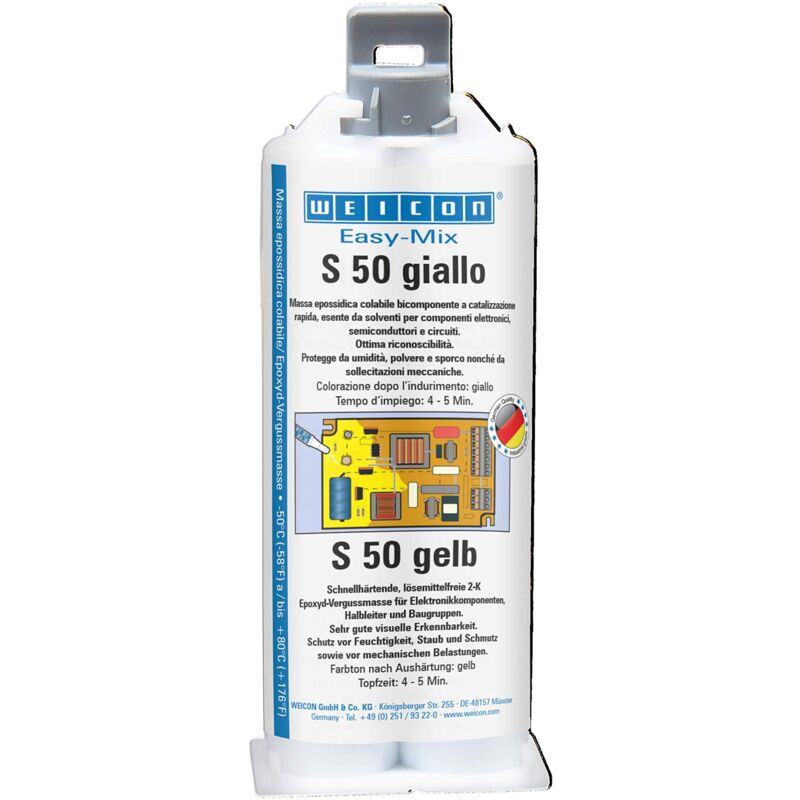 WEICON Easy-Mix S 50 giallo, a polimerizzazione rapida, sigillante epossidico bicomponente a 2 componenti senza solventi CARATTERISTICHE WEICON Easy-Mix S 50 yellow è un sigillante altamente reattivo che può essere usato anche come adesivo grazie alla sua forte adesione e alla rapida polimerizzazione. Il sistema di resina epossidica è viscoso, autolivellante e polimerizza rapidamente e resistente agli urti. Il composto di colata ha un'elevata adesione e una breve durata in pentola, che è di 4-5 minuti. Il composto aderisce molto bene a una grande varietà di superfici, come metallo, plastica, plastica rinforzata con fibre di vetro, legno, vetro, ceramica e pietra. APPLICAZIONE Easy-Mix S 50 giallo è adatto per applicazioni in diversi settori, come lavori di colata nell'elettrotecnica e nell'industria elettronica, per collegamenti di cavi di colata, per lavori nella tecnica di isolamento, nella costruzione di metalli, nella costruzione di container e apparecchi, nella costruzione di