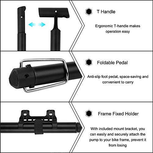 【FACILE DA USARE】 - Canna in alluminio con impugnatura ergonomica dal design confortevole, pompaggio a doppia azione e blocco del pollice, capacità fino a 130 psi che consente di utilizzare questa pompa da pavimento per gonfiare la gomma della bici da terra durante la riparazione di emergenza o mantenere la pressione della gomma Durante le lunghe pedalate, questa mini pompa da bici viene fornita anche con ago di gonfiaggio, che puoi gonfiare anche per palloni sportivi;